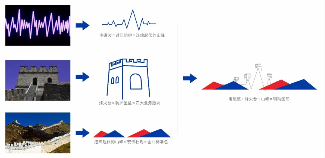 輔助圖形以長城為主元素+電磁波形+山峰組合而成,形成一套完善的防御系統(tǒng),堅不可摧的長城完美詮釋檳城電子的過壓防護理念和愿景,為檳城電子的產品代言。